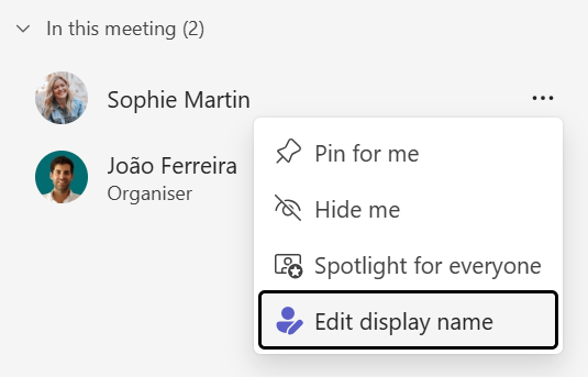 From the meeting controls, they open People, locate their own name in the participants list, select More options, and choose Edit display name. The new name is applied immediately and is visible to everyone in the meeting.